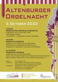 Die neugegründete Mitteldeutsche Orgelgesellschaft Altenburg veranstaltet am Tag der Deutschen Einheit, dem 3. Oktober 2022, die Altenburger Orgelnacht. Es finden Konzerte in der Brüderkirche und in der Schlosskirche des Residenzschlosses Altenburg statt.